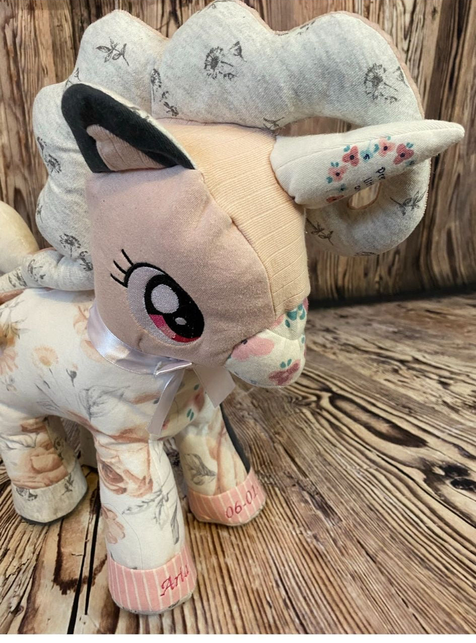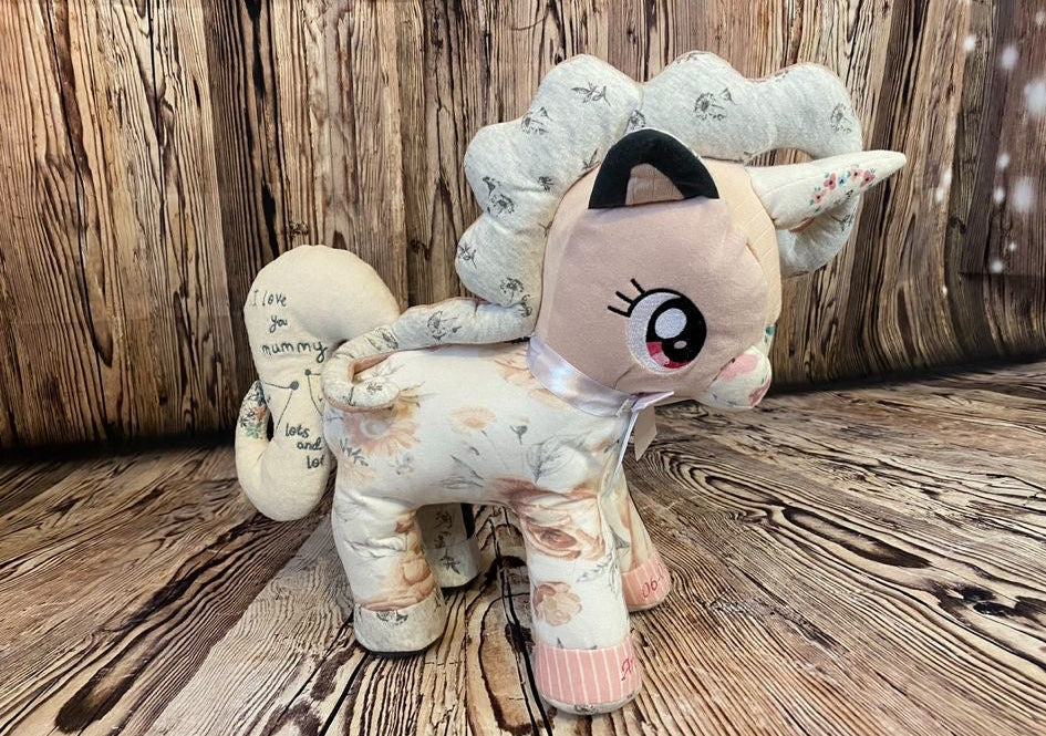 Lions, Elephants & Ponies: These adorable keepsake toys are made from 9 of your clothing items, carefully crafted to preserve the memories in every stitch.